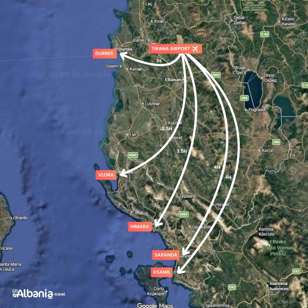 For southern beach destinations like Ksamil, Saranda, Himarë, Dhërmi and Gjipe, expect a longer journey from Tirana, but the reward is access to some of the most beautiful beaches in Albania.